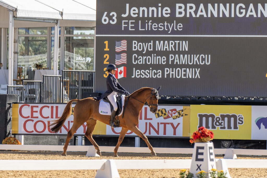 Jennie Brannigan (USA) and FE Lifestyle took third overnight after dressage on a score of 32.8. After taking a hard fall off a different horse at Morven Park last weekend, she opted to withdraw Connory, her other Maryland mount, from competition to focus on the more experienced FE Lifestyle.