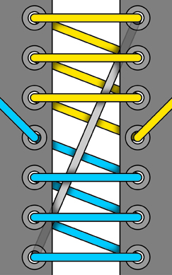 5. The top (yellow) end of the lace is similarly passed across then zigzagged under from the top set of eyelets down to the middle ones.