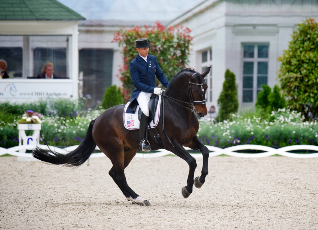 When you feel a little better about how he is going, turn down the centerline again; this time, however, I want you to take away one aid, not add more. During the break, your thinking should have gone like this: “If I use one leg more than the other, my horse will move away from my active leg. I don’t think my aids lack symmetry, but let’s see.” Down the centerline you go again, but this time you keep your hands quiet, and instead of adding any aids, you merely soften your right leg. In other words, take away the aid that might be causing the problem. Ride your horse down the centerline, and observe his reactions.